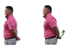 This exercise can be performed in sitting or standing, but may be more effective from standing if your backrest is too high. Begin by clasping your arms behind your head. Pull back your elbows as you simultaneously lean your trunk backwards. Cue yourself to lift your chest and press your hips forward to create an arch through your low back. Take a deep breath, then exhale as you return to the starting position. Repeat for 10 reps.